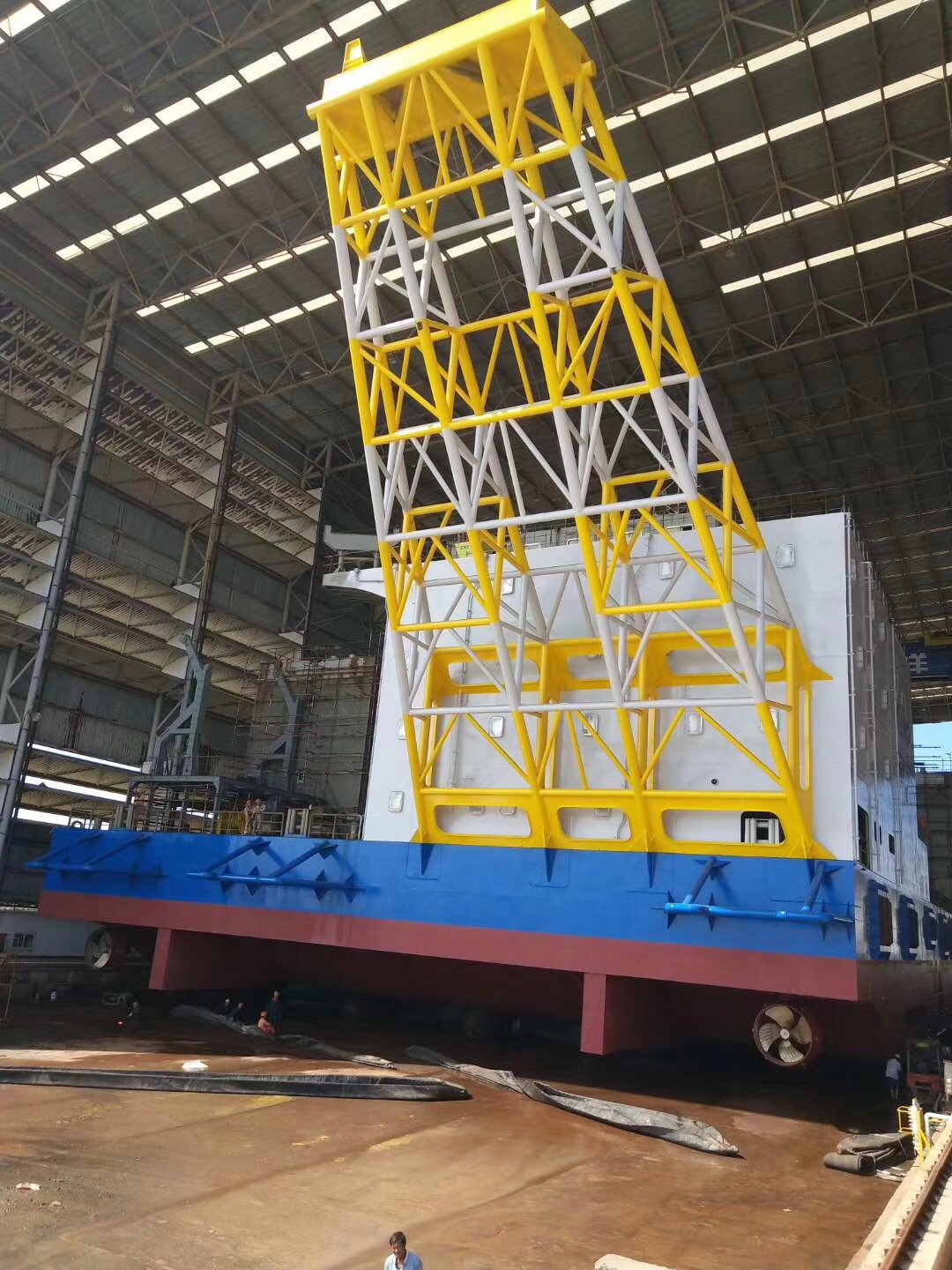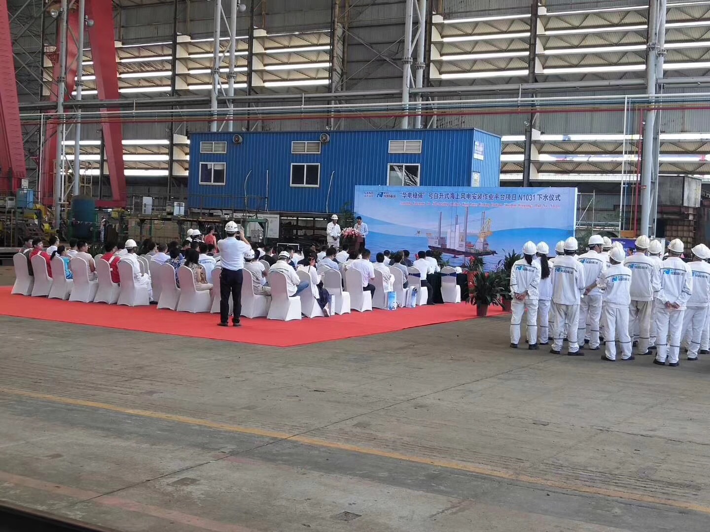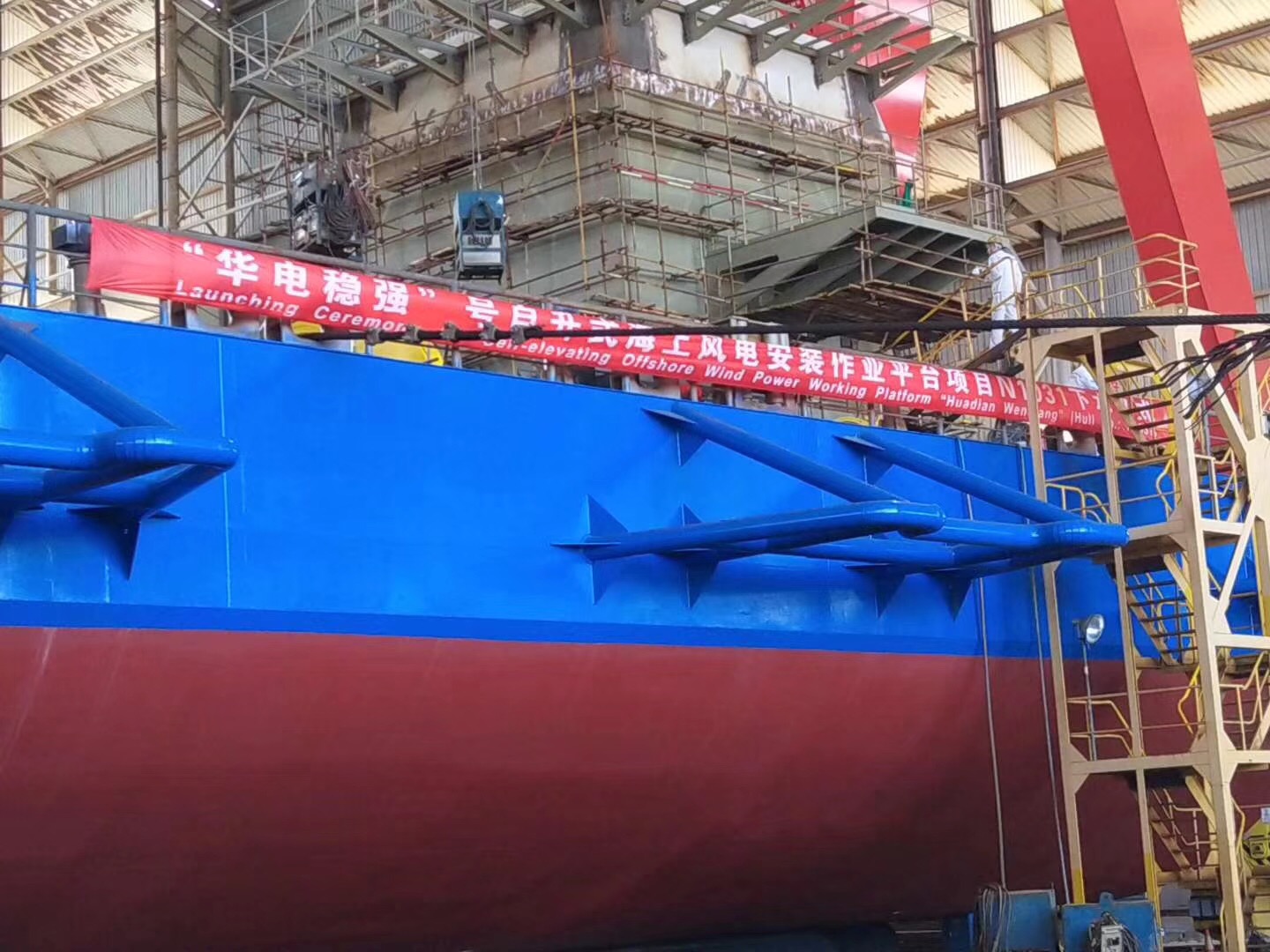 熱烈祝賀由南通豪通船務(wù)在潤(rùn)邦海洋總包主船體搭載工程的“華電穩(wěn)強(qiáng)”號(hào)自升式海上風(fēng)電安裝作業(yè)平臺(tái)于2018年8月28日中午順利下水!