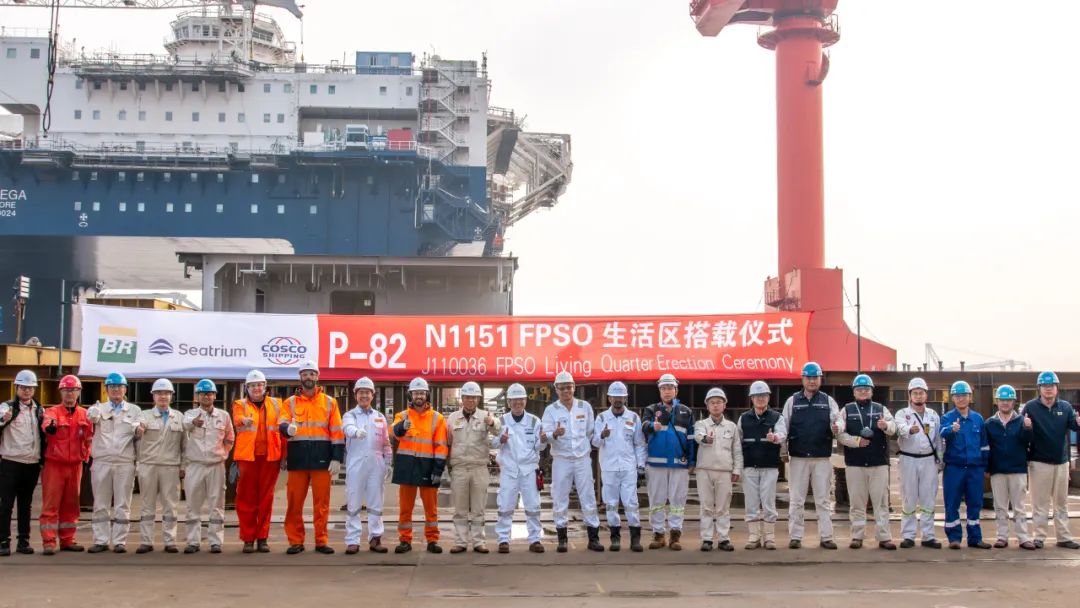11月16日,啟東中遠(yuǎn)海運(yùn)海工舉行N1151 P-82 FPSO生活區(qū)模塊搭載儀式。船東方代表、ABS船級(jí)社代表、啟東中遠(yuǎn)海運(yùn)海工項(xiàng)目組成員參加了搭載儀式。